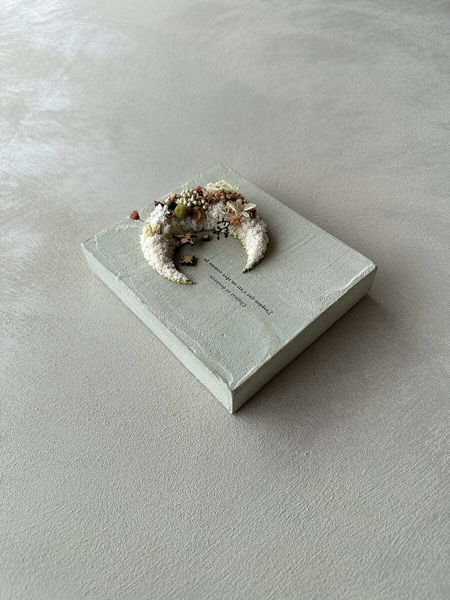 愛されている三日月をドライフラワーでかたどったボタニカルボードです。