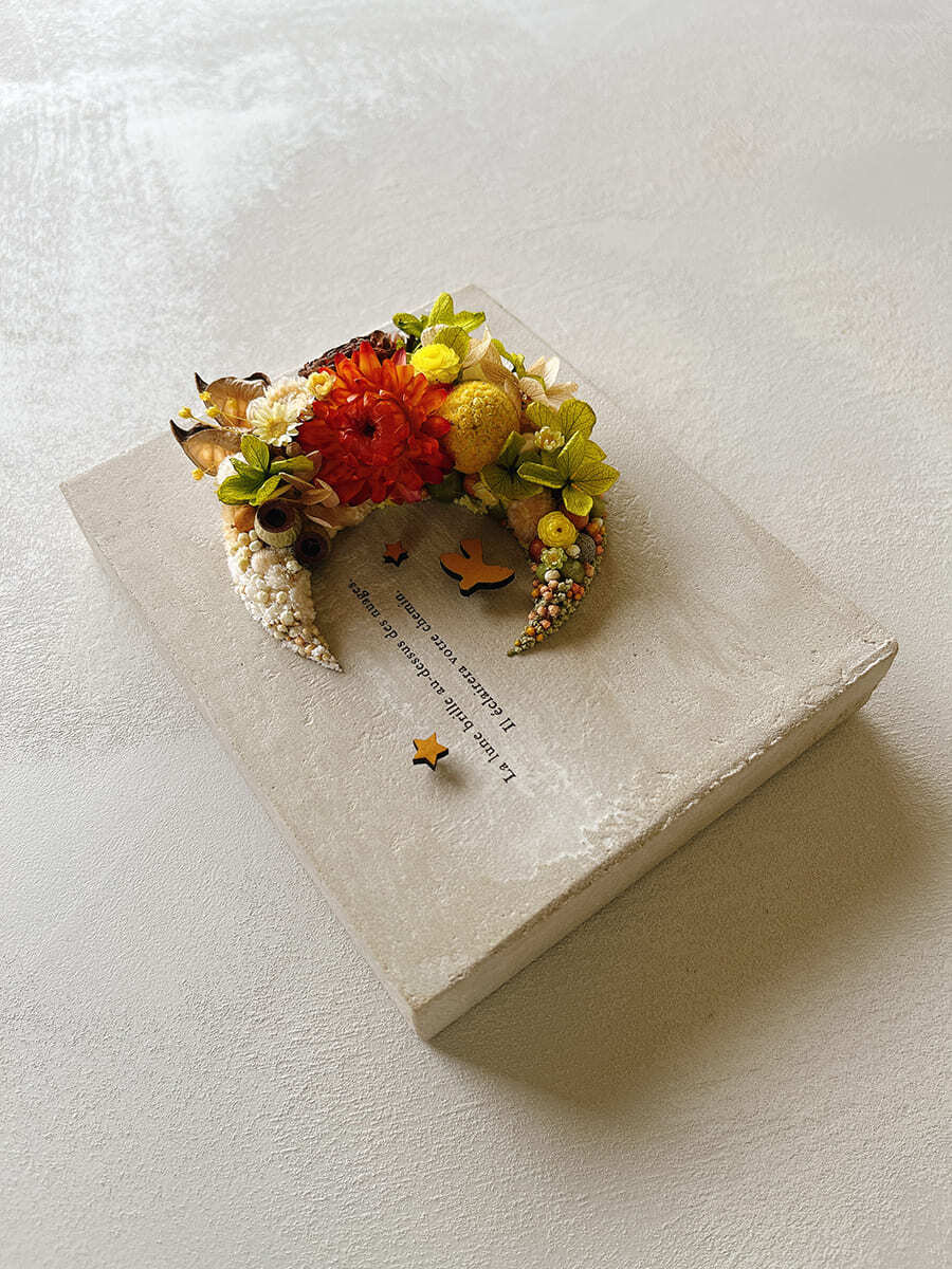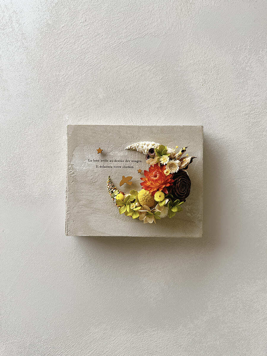 愛されている三日月をドライフラワーでかたどったボタニカルボードです。