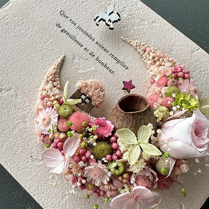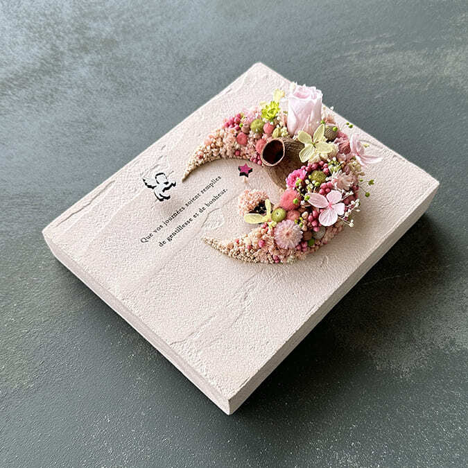 愛されている三日月をドライフラワーでかたどったボタニカルボードです。