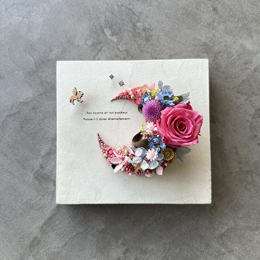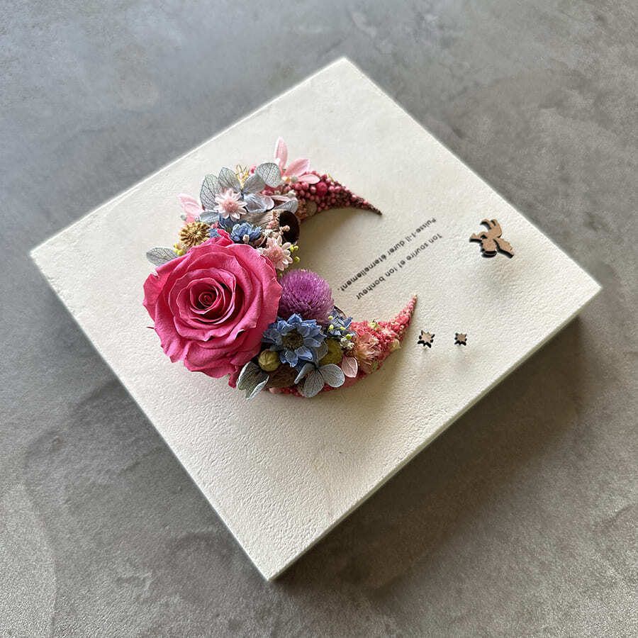 愛されている三日月をドライフラワーでかたどったボタニカルボードです。