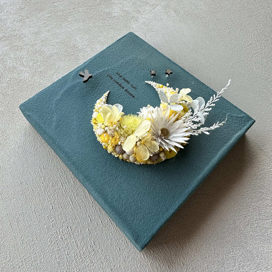 愛されている三日月をドライフラワーでかたどったボタニカルボードです。