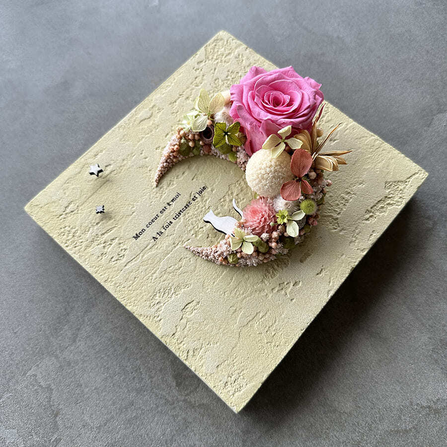 愛されている三日月をドライフラワーでかたどったボタニカルボードです。