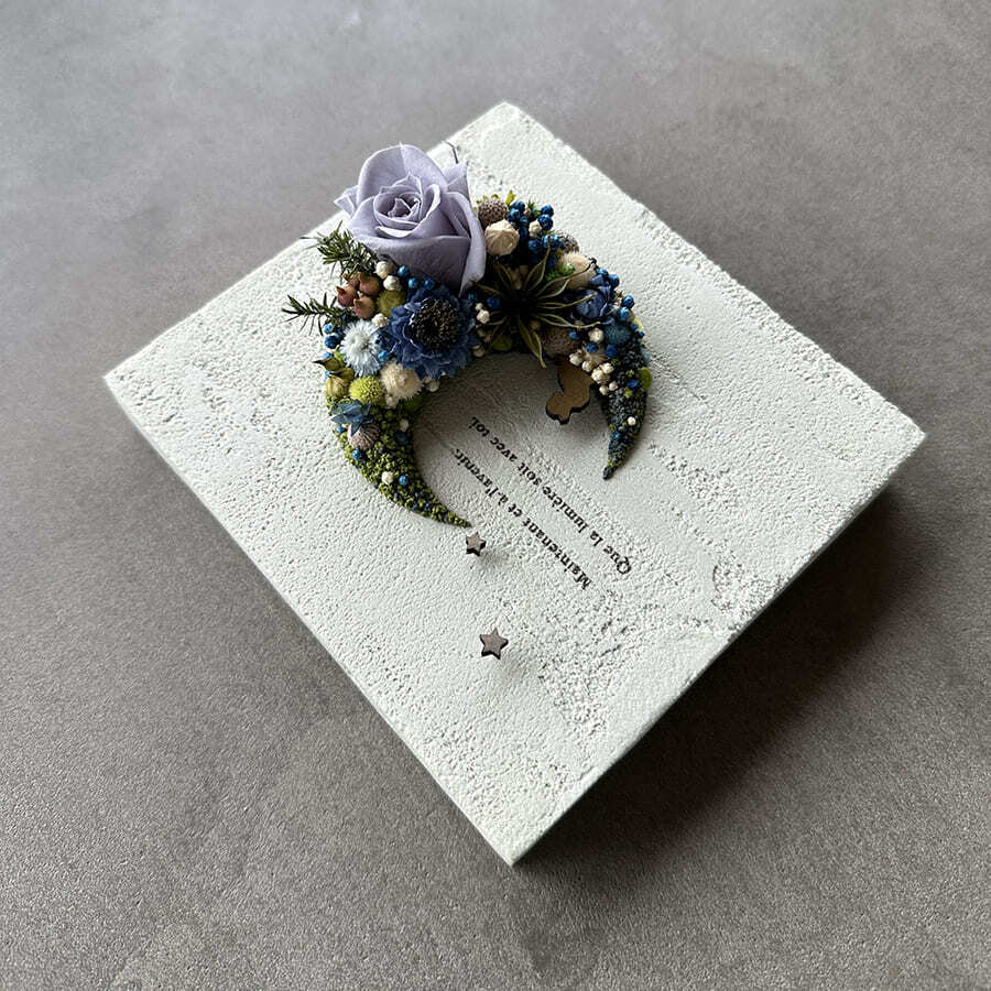 愛されている三日月をドライフラワーでかたどったボタニカルボードです。