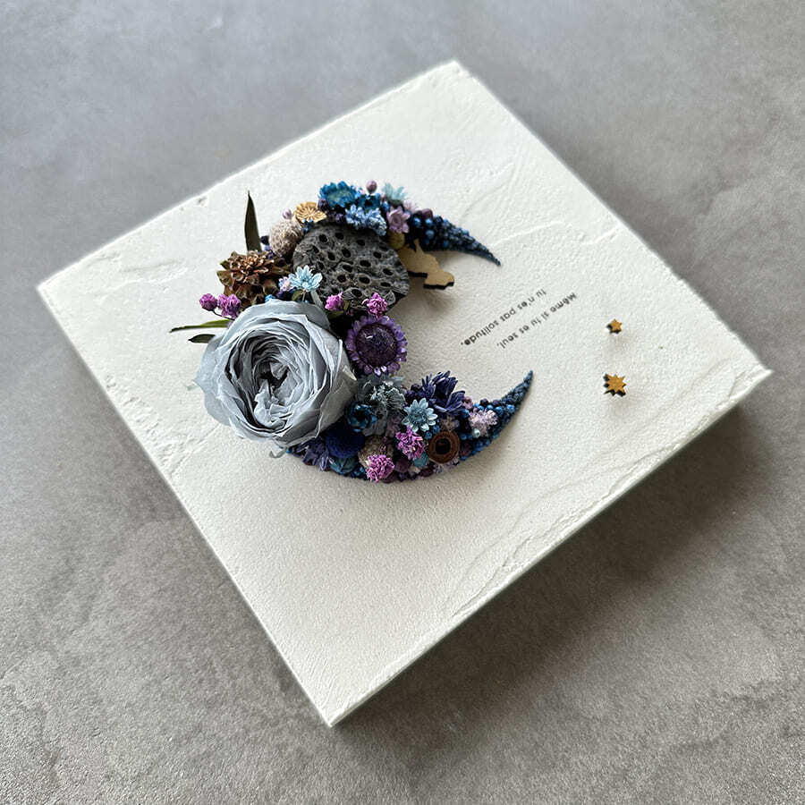 愛されている三日月をドライフラワーでかたどったボタニカルボードです。