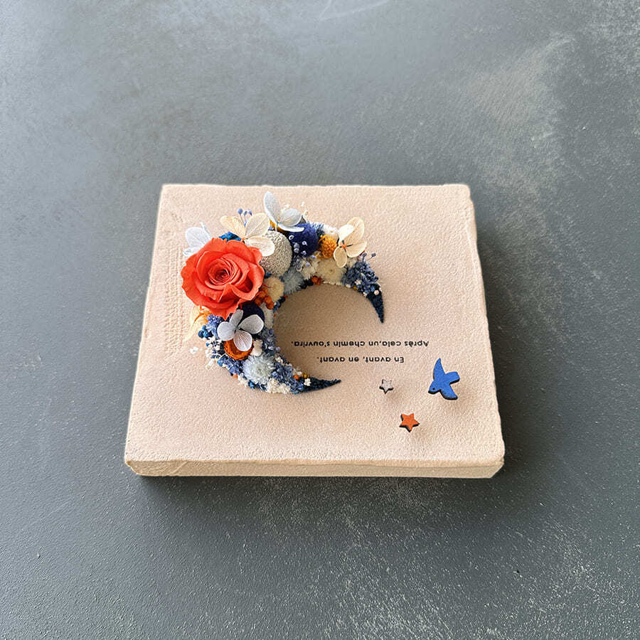愛されている三日月をドライフラワーでかたどったボタニカルボードです。