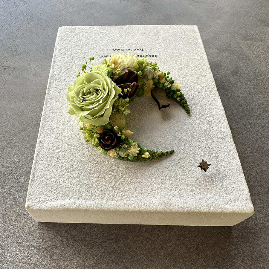 愛されている三日月をドライフラワーでかたどったボタニカルボードです。