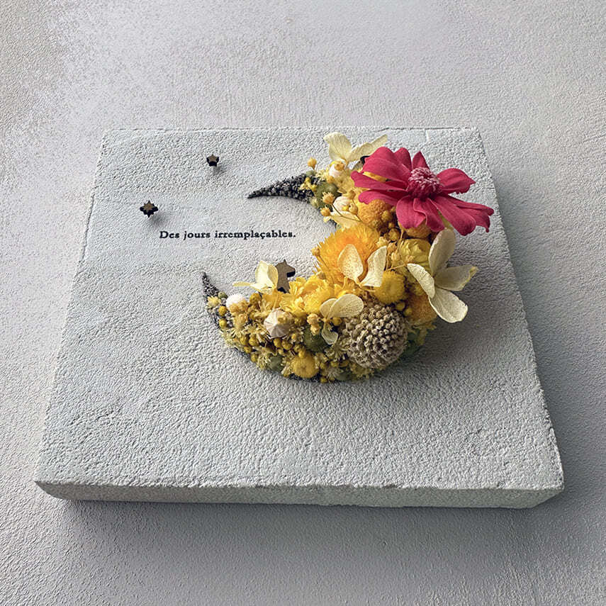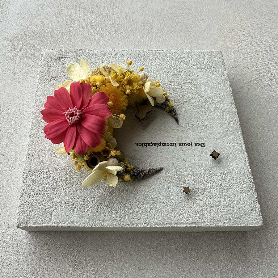 愛されている三日月をドライフラワーでかたどったボタニカルボードです。
