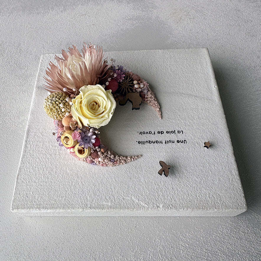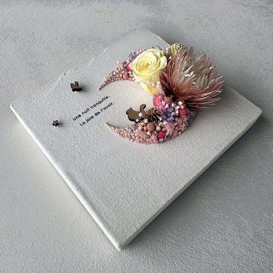 愛されている三日月をドライフラワーでかたどったボタニカルボードです。