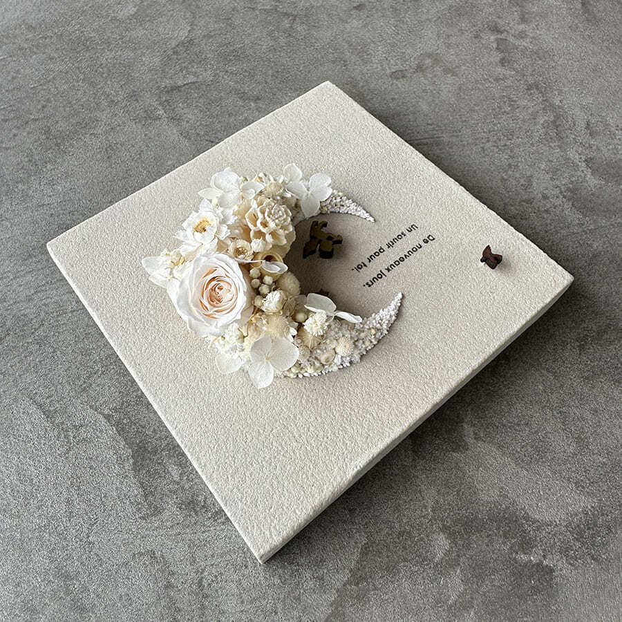 愛されている三日月をドライフラワーでかたどったボタニカルボードです。