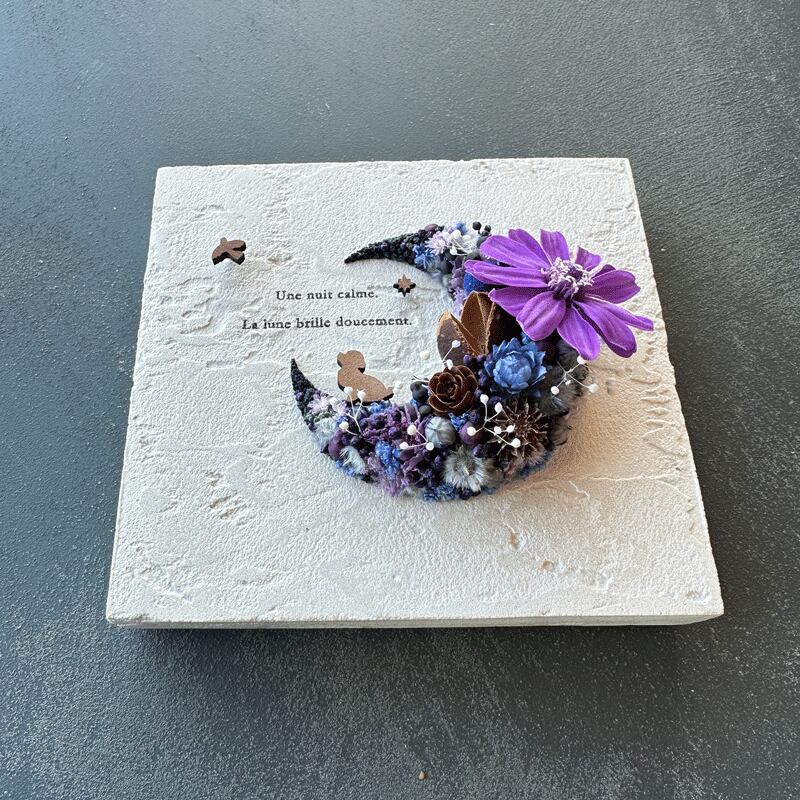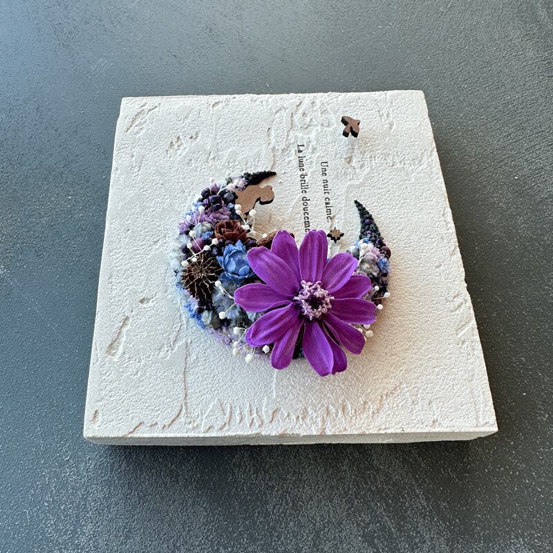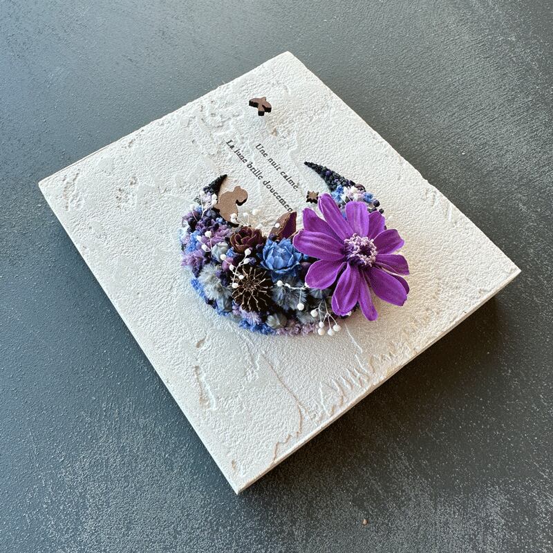 愛されている三日月をドライフラワーでかたどったボタニカルボードです。