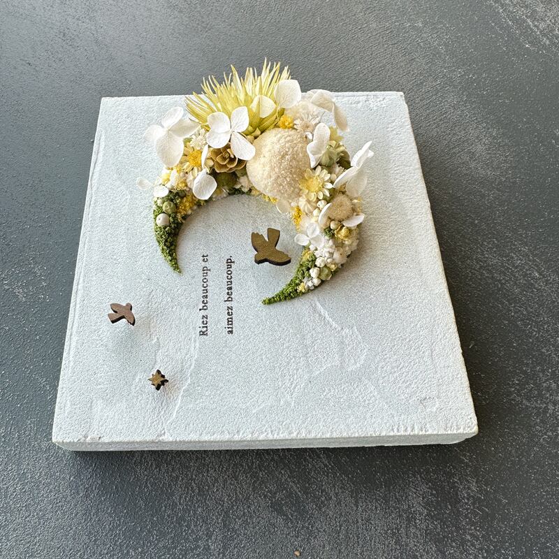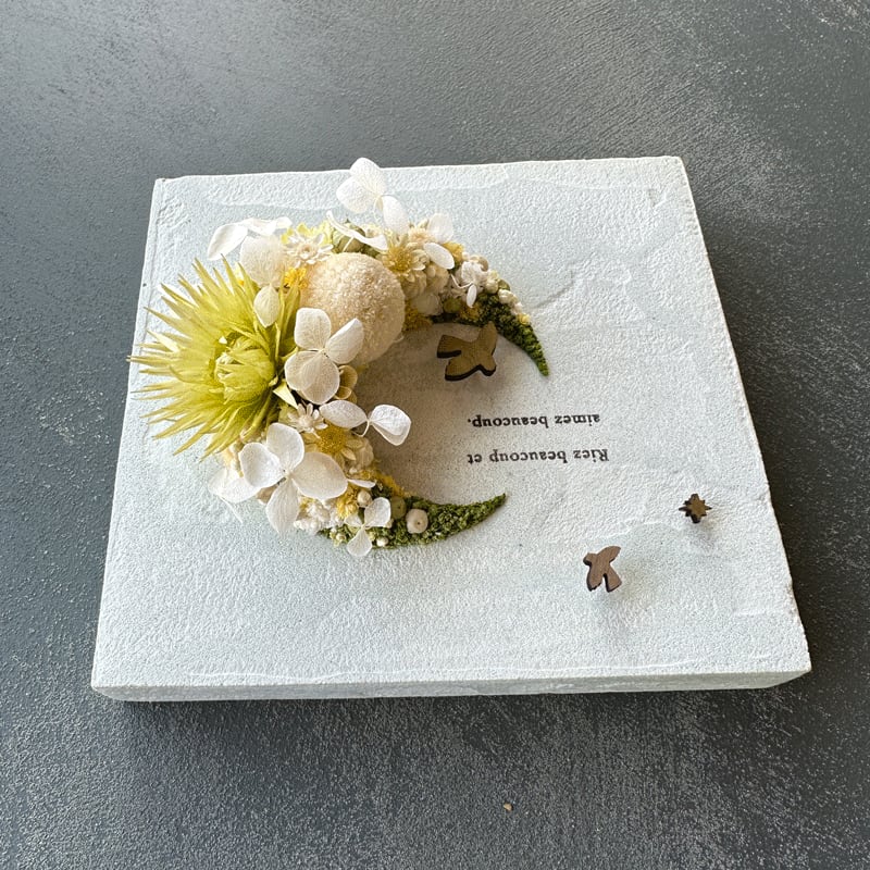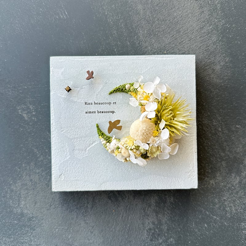 愛されている三日月をドライフラワーでかたどったボタニカルボードです。
