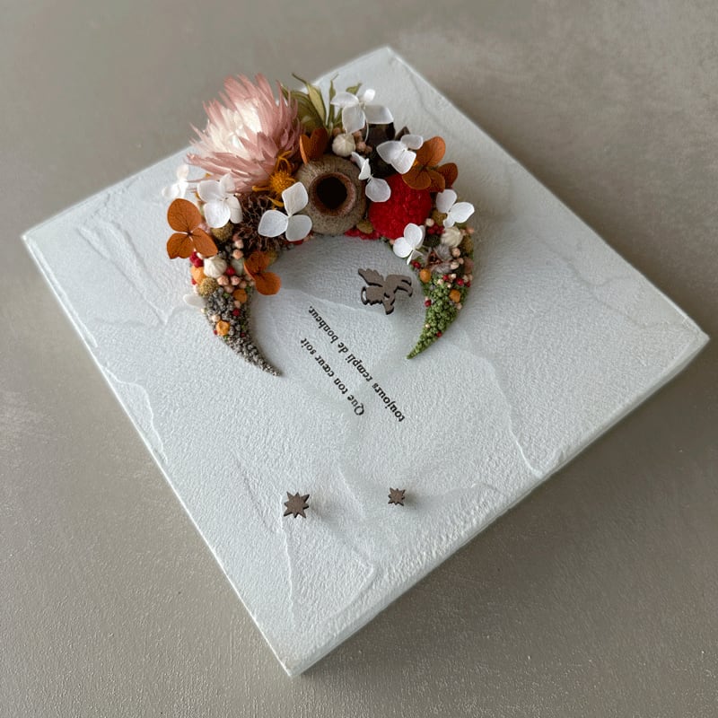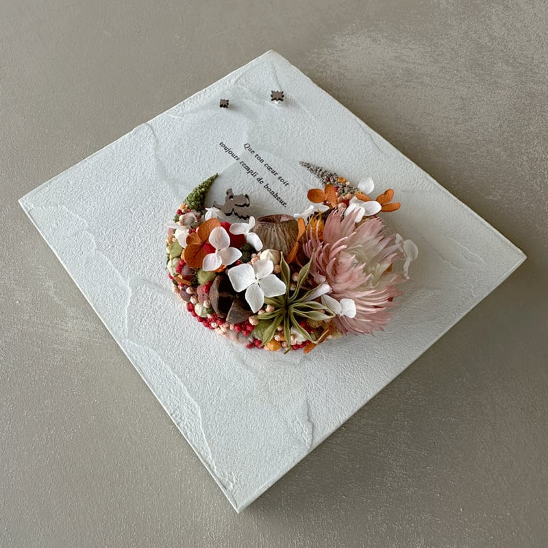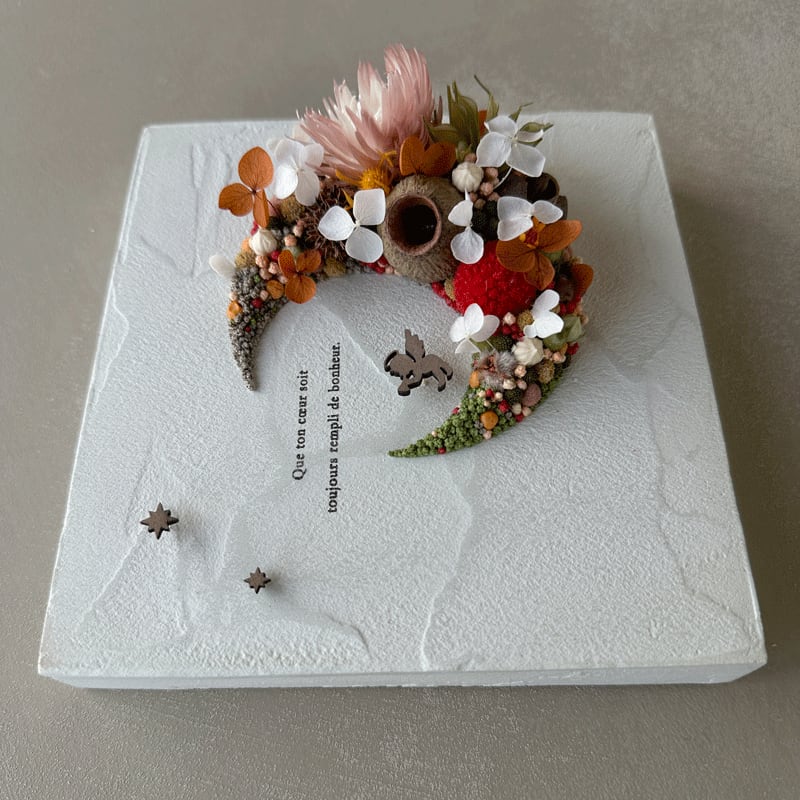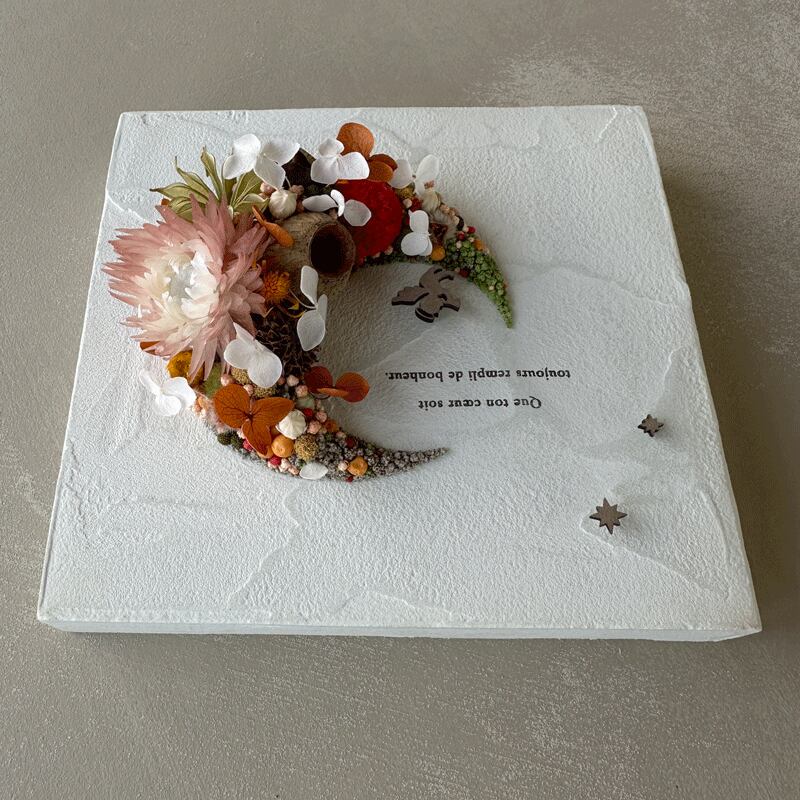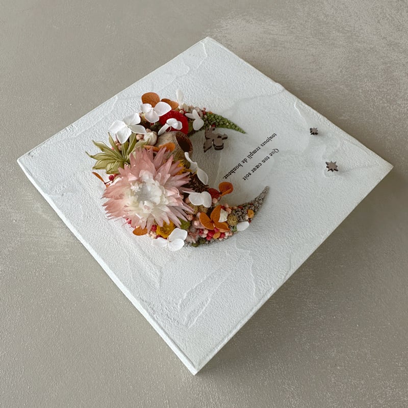 愛されている三日月をドライフラワーでかたどったボタニカルボードです。
