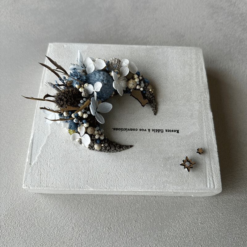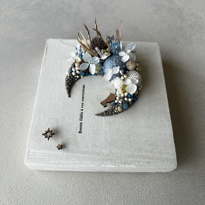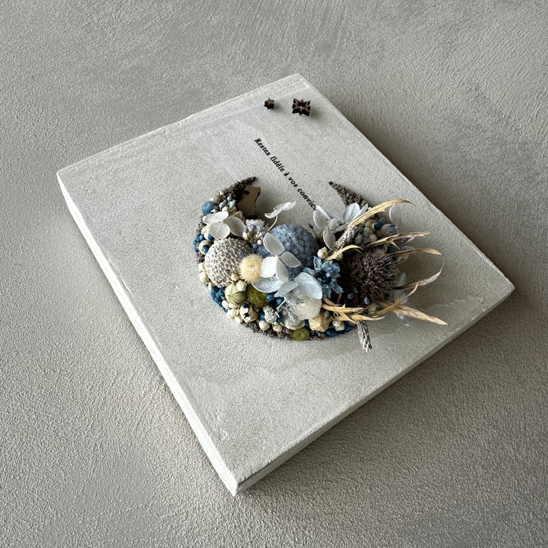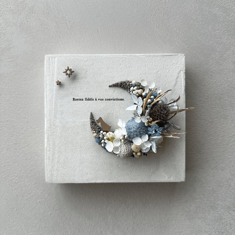 愛されている三日月をドライフラワーでかたどったボタニカルボードです。