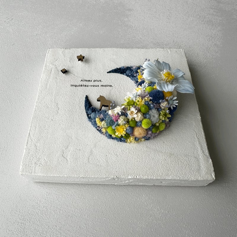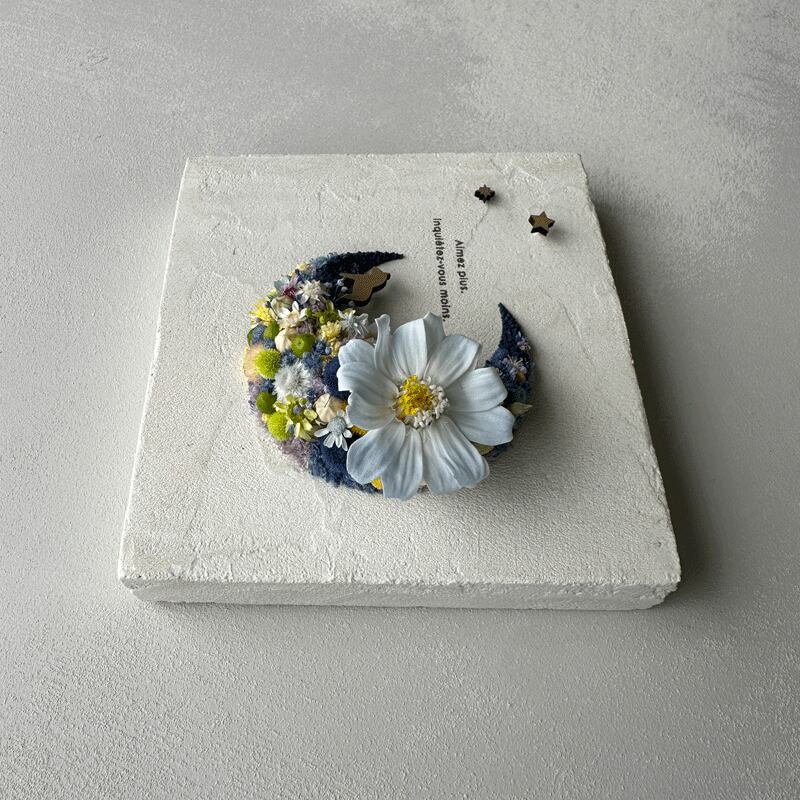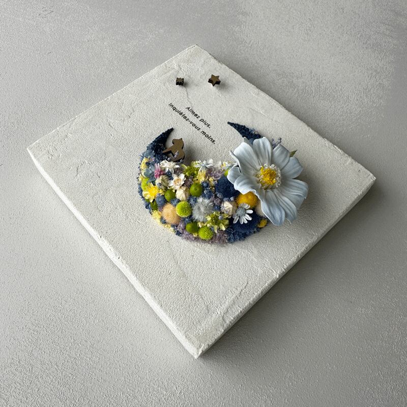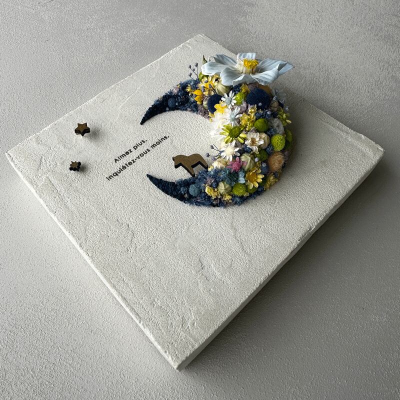 愛されている三日月をドライフラワーでかたどったボタニカルボードです。