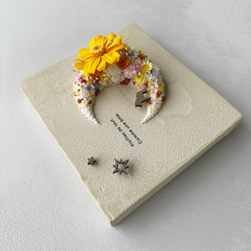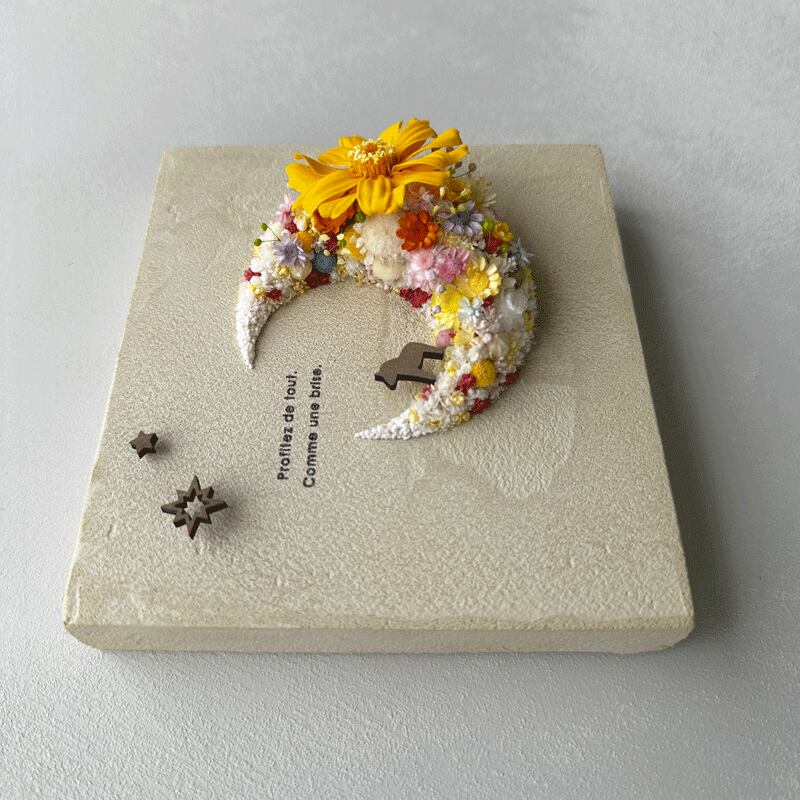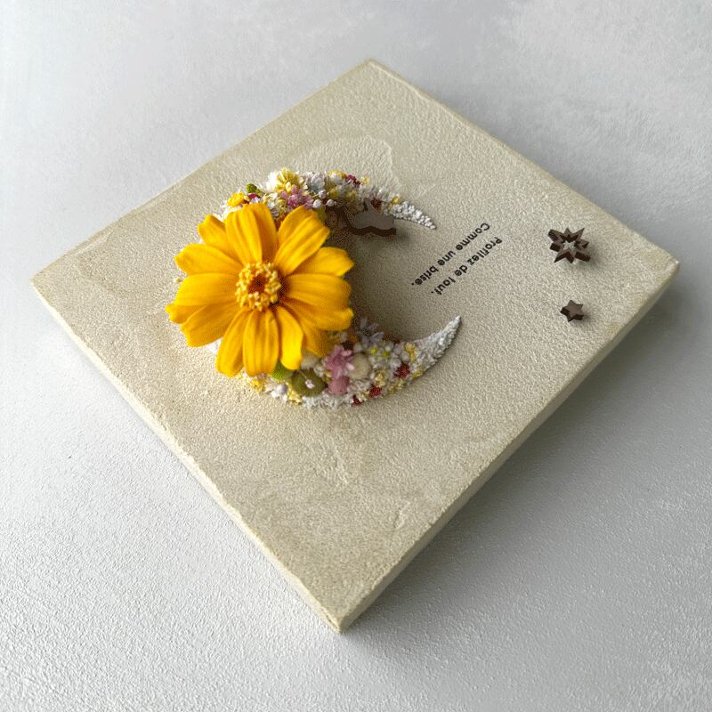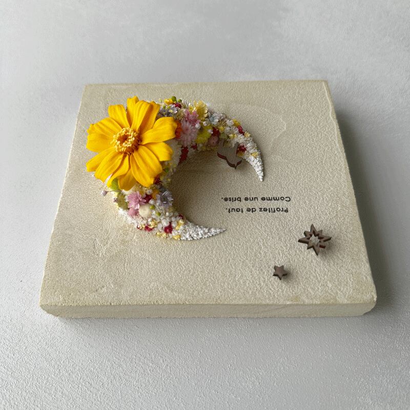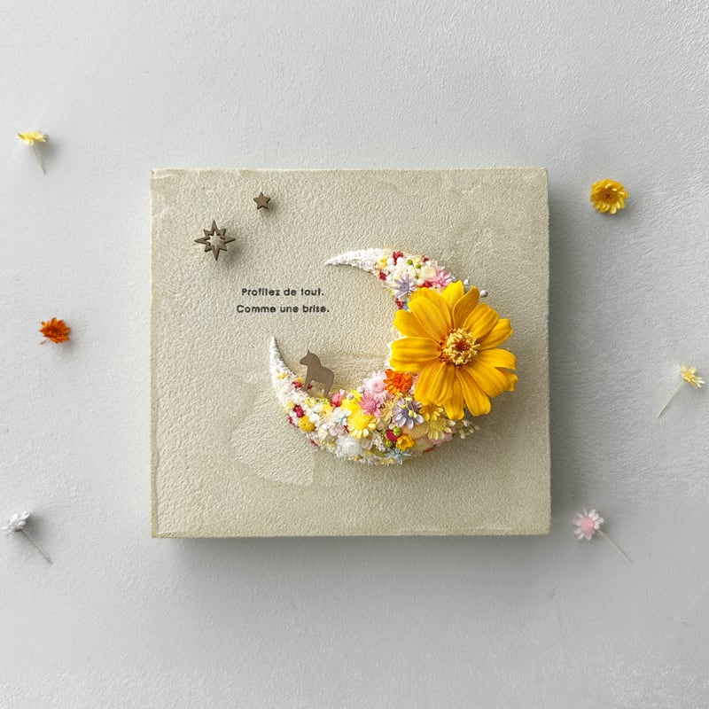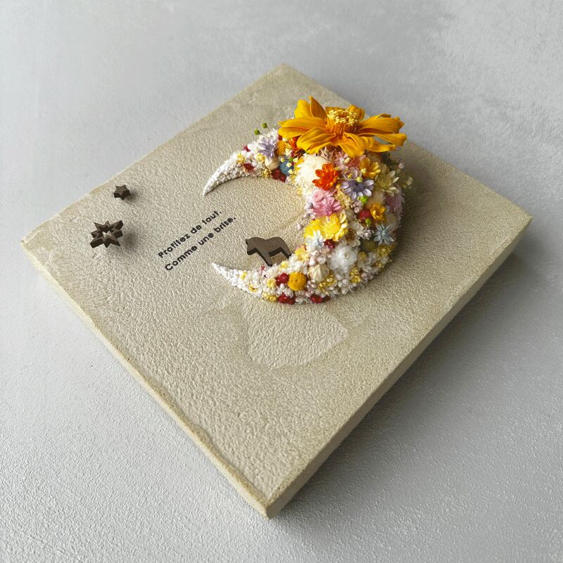 愛されている三日月をドライフラワーでかたどったボタニカルボードです。