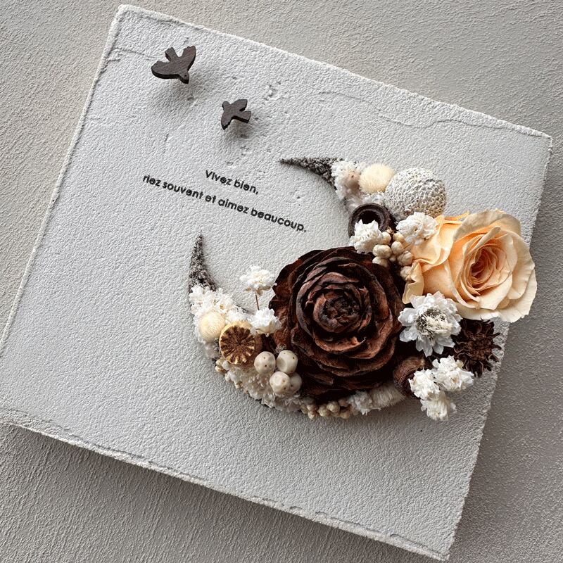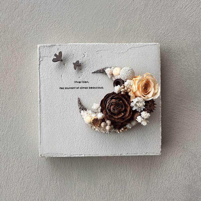 愛されている三日月をドライフラワーでかたどったボタニカルボードです。