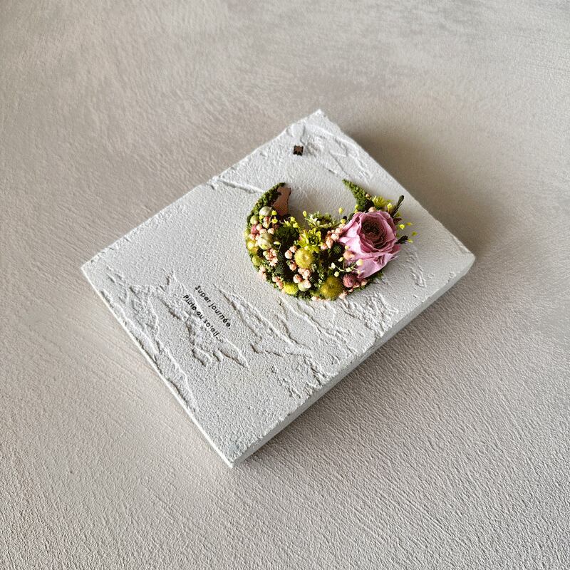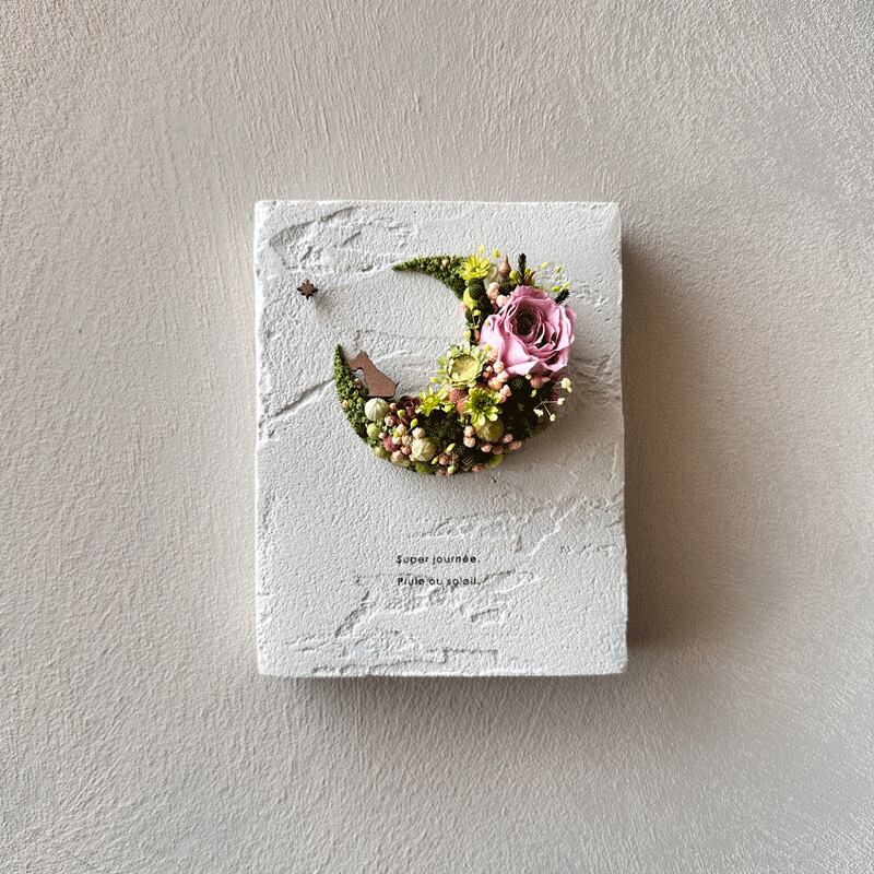 愛されている三日月をドライフラワーでかたどったボタニカルボードです。