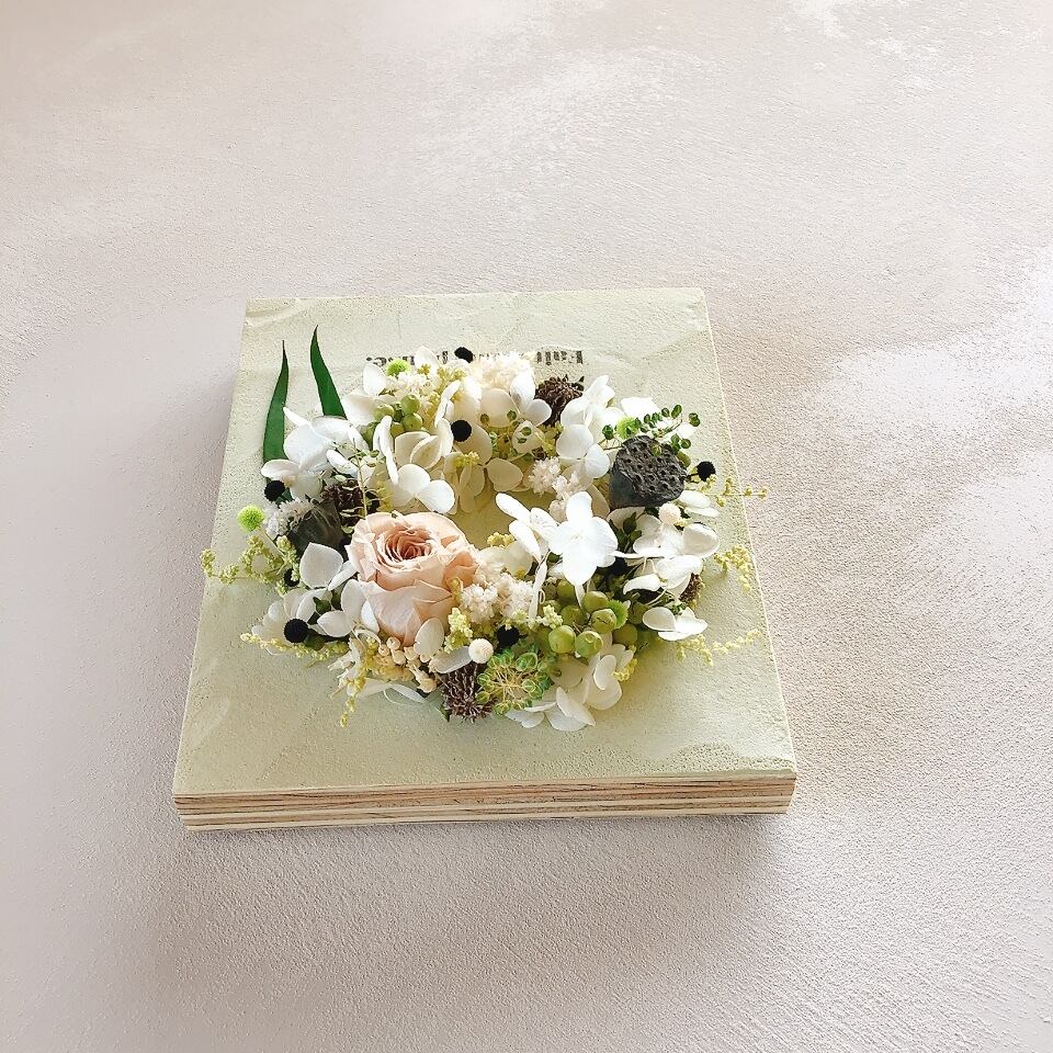 紫陽花をベースにしたリース型のボタニカルボードです。