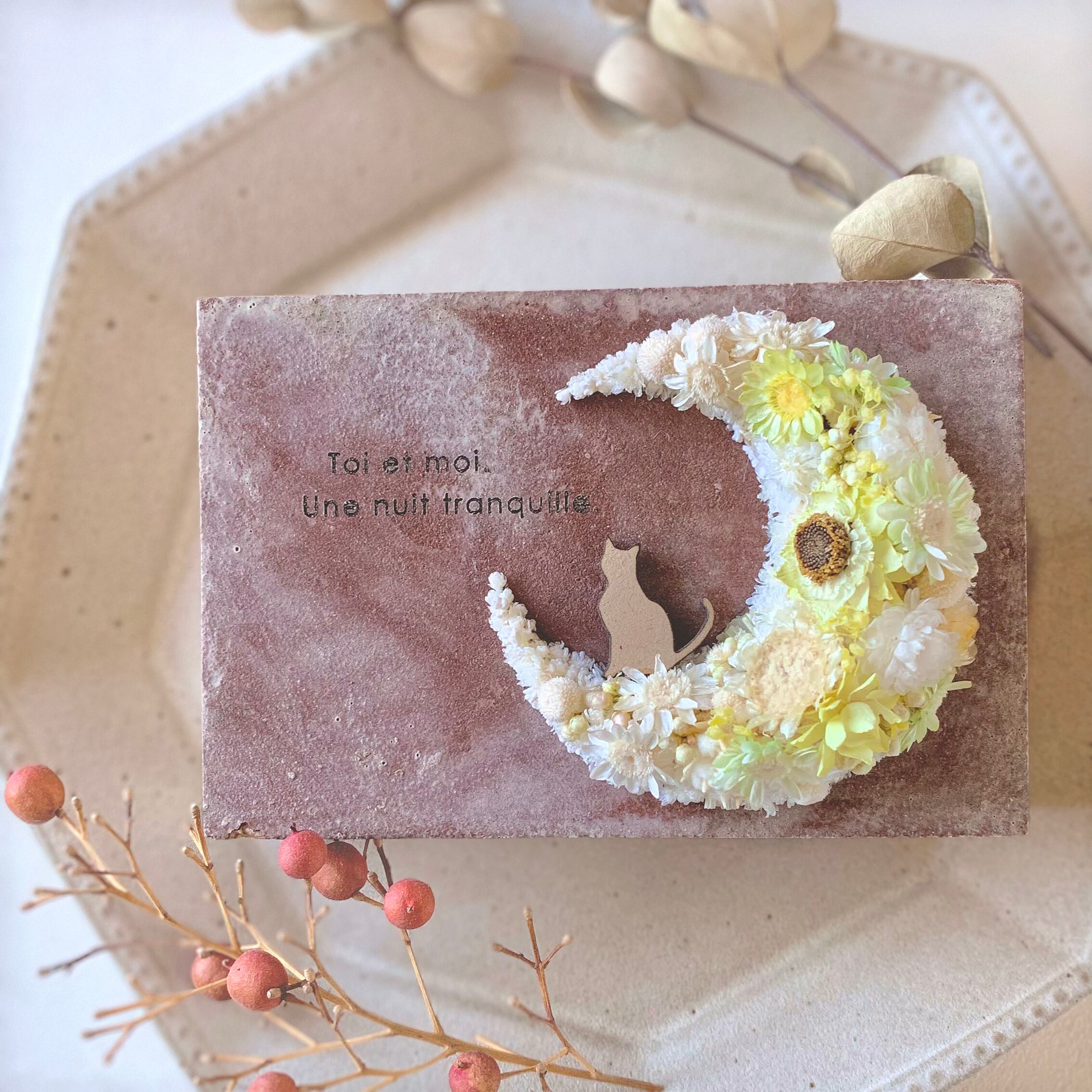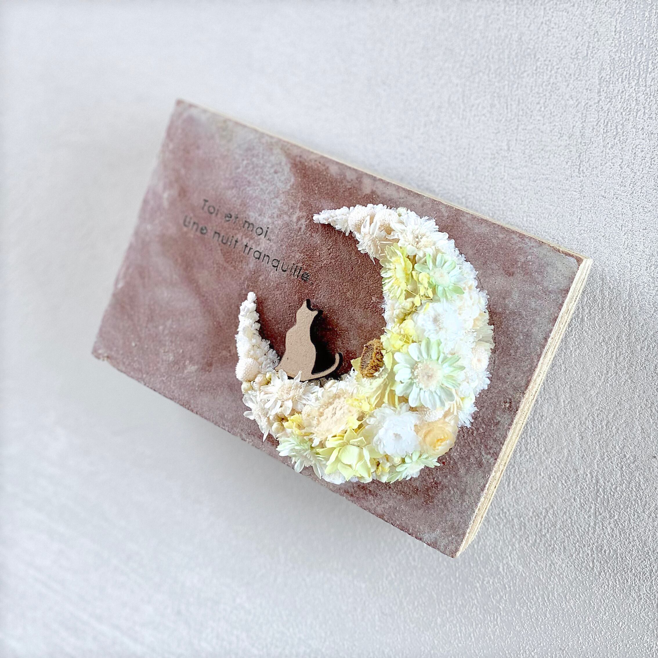 #ボタニカルアート #月#ネコ#ねこ#愛猫#cat#MOON #お月様 #ギフト #壁掛け #雑貨 #ボタニカル #ドライフラワー #インテリア #プリザーブドフラワー #木工雑貨 #SGDs #一人暮らしインテリア #華やか#カラフル #大人雑貨 #エントランスエリア #壁掛け雑貨 #玄関